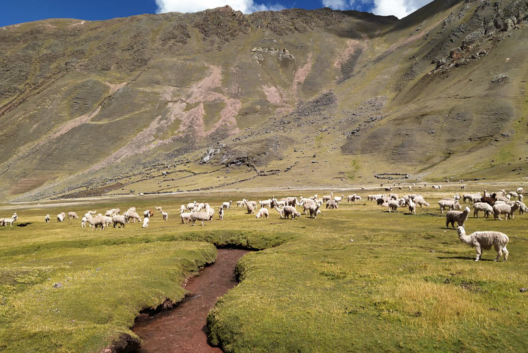 Early, we leave at 4:00 AM and head south-east of the city of Cusco, after 1 hour and 30 min. We will make a stop at the restaurant to have breakfast and then continue for 1 hour and 30 more minutes until we reach the starting point of the walk that leads us to the viewpoint of the Rainbow Mountain, the walk lasts an average of 2 hours until we reach the viewpoint from the mountain of colors, you need to be 30 min. or the time that is pertinent to be able to visit the different viewpoints and take advantage of the best photographic shots, from this place you can also admire the landscape of the Ausangate mountain glacier and the various orographic formations that surround it. At the end of the visit to Vinicunca, we will continue with an initial descent to take the path up to the Red Valley viewpoint, where we will admire the wonderful landscape, we will have enough time to contemplate and take the best photos and then continue with the walk of descent that takes us to the lower part of the Red Valley where the Yawar Mayu or Red River flows, coloration product of soil erosion, the section lasts an average of 4 hours of descent with a landscape surrounded by cultivated fields and a huge amount of alpacas. At the end of the walk we will board our van that will take us to the lunch place and then continue the return to Cusco.